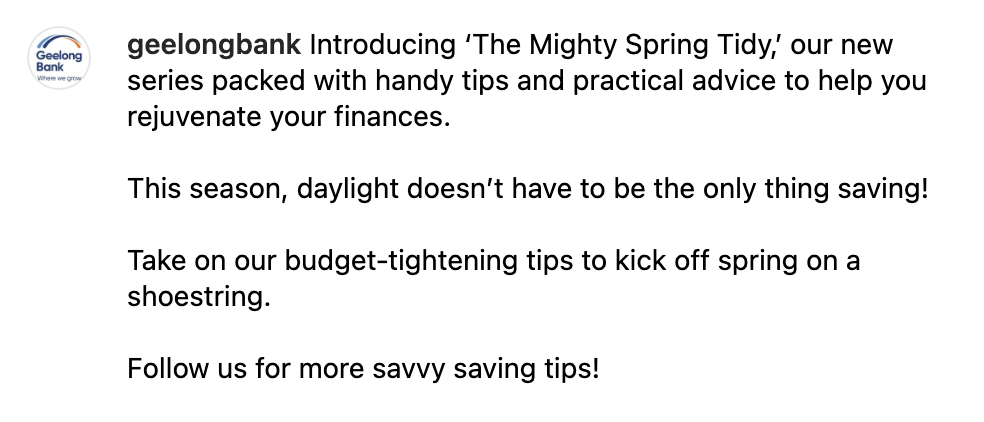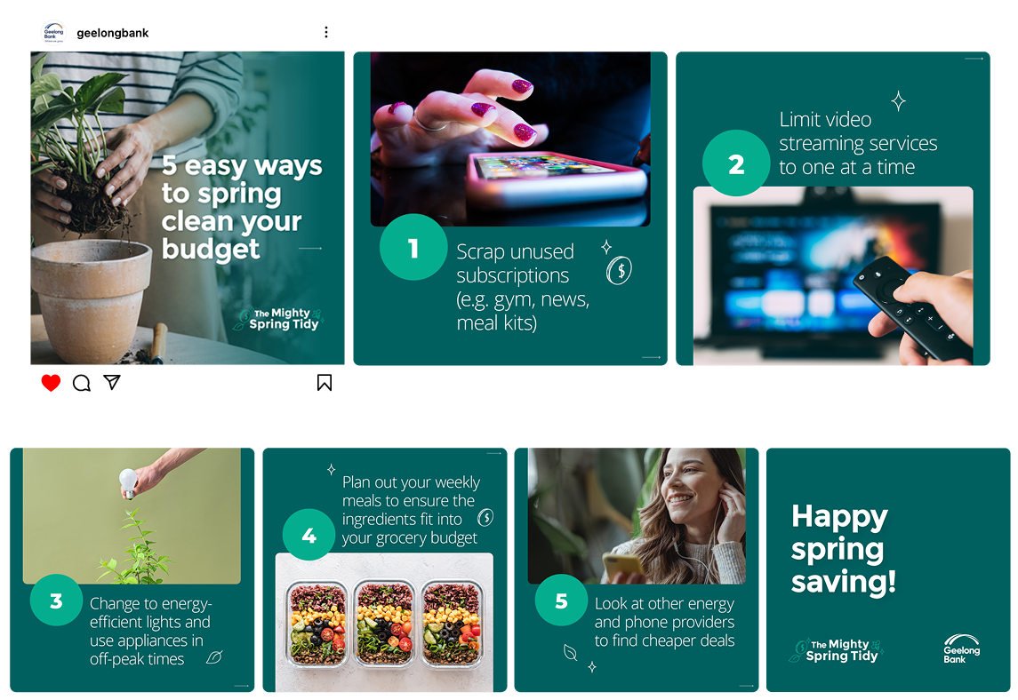 Throughout spring, we implemented an engagement strategy to connect with Geelong Bank’s audience through spring cleaning challenges and tips tied into the season.