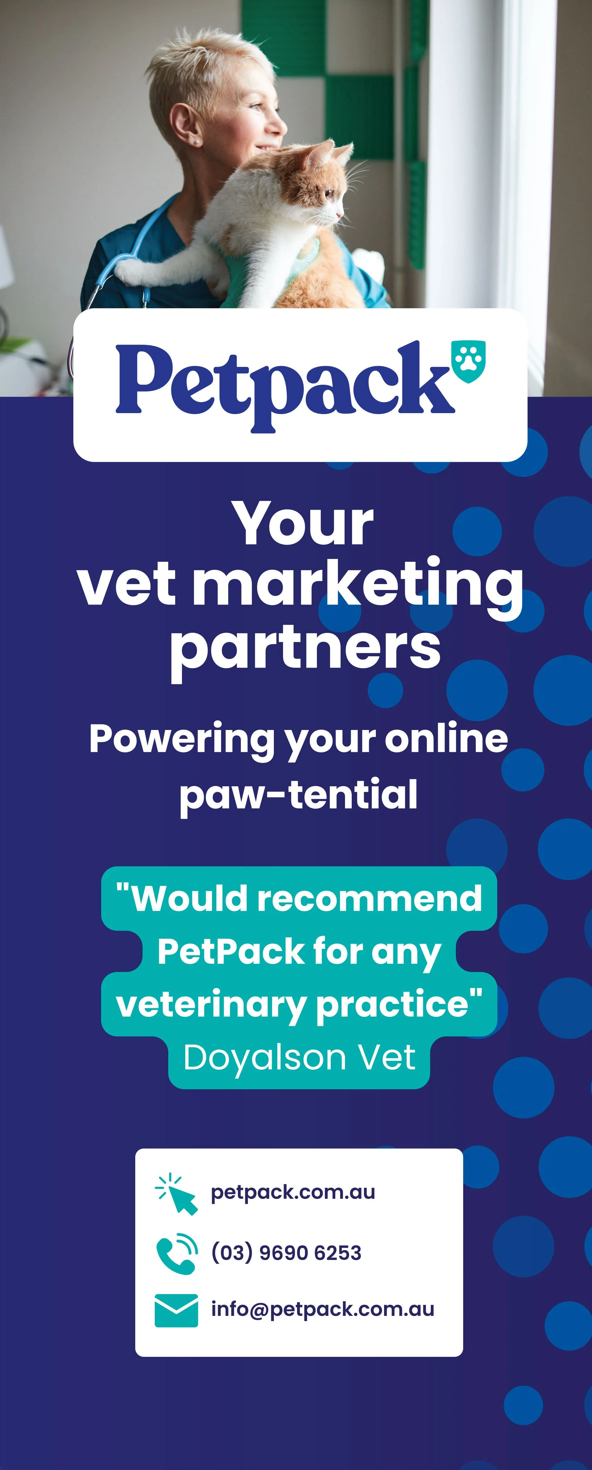 At the annual Australian Veterinary Association conference in March 2022, PetPack needed promotional banners that would stand out. As the first conference since rebranding (and since the pandemic), it was time to get back on the scene, build brand awareness and connect with potential leads (veterinary practice owners).